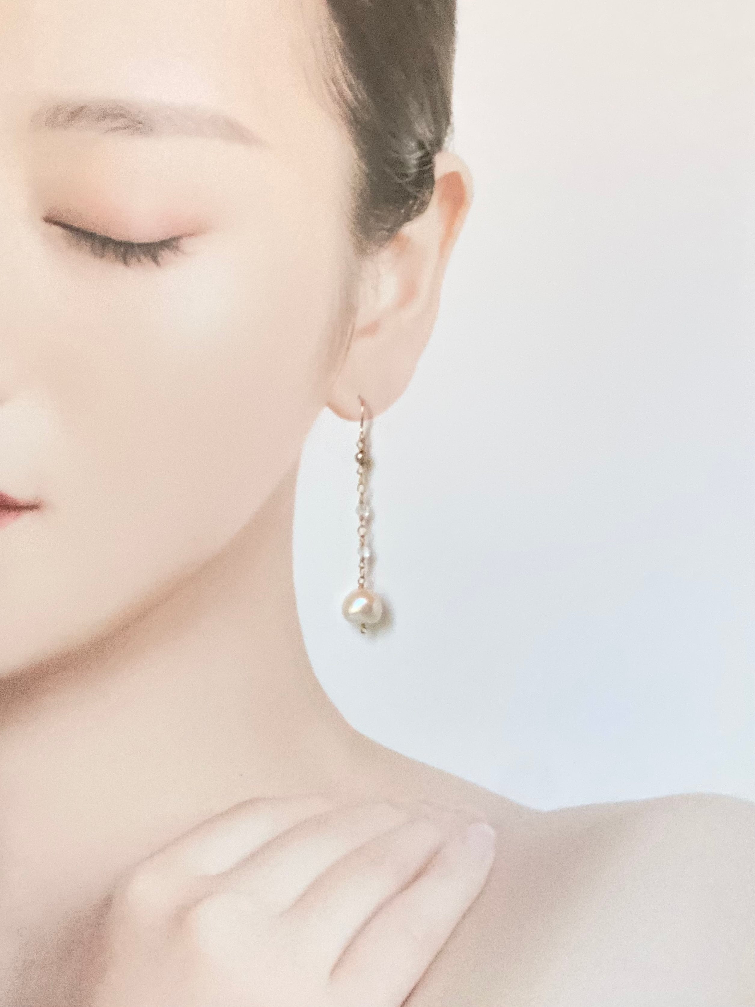 自然が生んだ少しいびつな大粒パールと、AAA級の小さな水晶が繊細にきらめきます